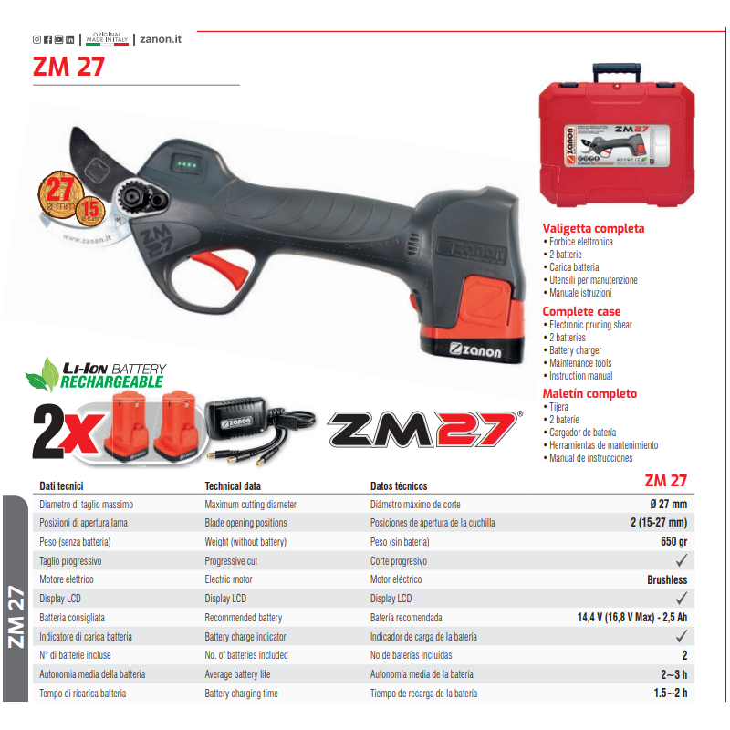 Gracias a su batería de litio recargable y a su motor brushless con sistema de movimiento accionado por engranajes, garantiza la máxima potencia con tiempos de recarga rápidos para permitir un trabajo continuo y preciso. Las hojas de acero intercambiables permiten una apertura máxima de 27 mm y el mango ergonómico fabricado en tecnopolímero de alta resistencia proporciona un agarre seguro que reduce la fatiga durante las operaciones de poda.