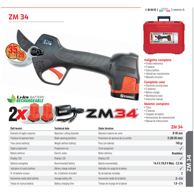 La apertura es mayor que la versión anterior, y esta tijera cuenta con un potente motor con sistema de refrigeración para cortar ramas de hasta 35mm. El nuevo perfil de afilado garantiza un corte limpio y preciso.