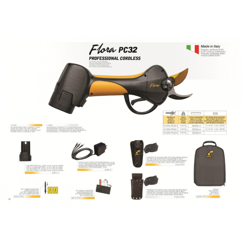 Para el desarrollo de estos modelos, se seleccionaron cuidadosamente proveedores y materiales de calidad para obtener un producto “Made in Italy” con certificación EUR1. El proyecto Flora nació gracias a la colaboración con la empresa italiana Vesco para el diseño y la producción de cuchillas forjadas cromadas forjadas de alta calidad y contracuchillas recubiertas de teflón. Este modelo se suministra con dos baterías de Litio profesionales intercambiables de 38Wh cada una.