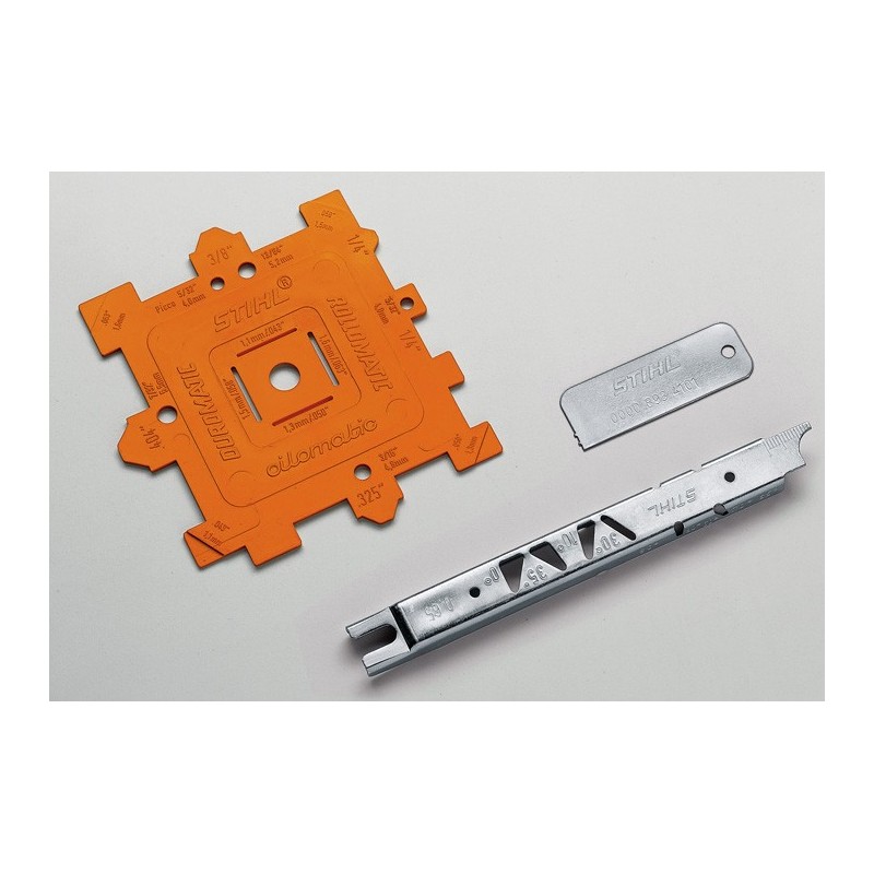 Para determinar la cadena y el paso de piñón de cadena, así como el grosor de los eslabones de accionamiento y el ancho de la ranura guía. Nota: Filegauges y desgaste de piñón no incluidos (piezas grises en la imagen).