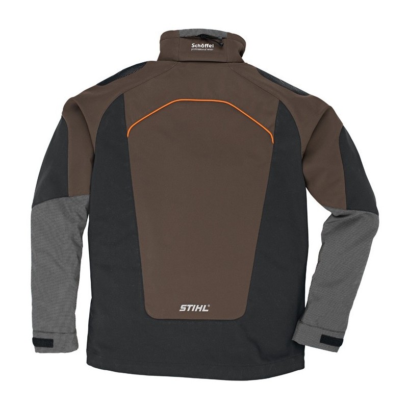 Extremadamente elástica, cálida y de secado rápido. Las zonas negras son repelentes al agua y dejan pasar el aire, las zonas de color marrón son impermeables y transpirables. Bolsillo interior, bolsillo en el pecho y protección contra la fricción en los hombros.