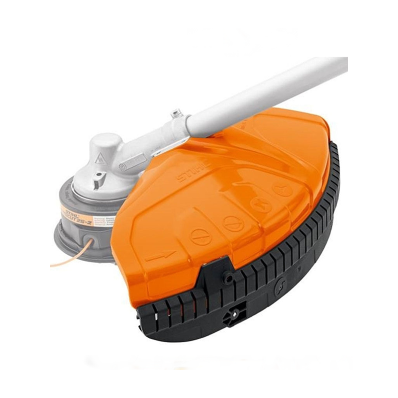 Protetor para trabalhar com cabeças de corte. Oferece proteção ao usar linha de nylon e cabeças de corte contra detritos em movimento, mas ainda permite uma visão clara da área a ser cortada.
